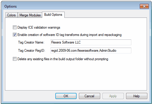 For information on the software ID tag options on the Build Options tab of the Options dialog box, see Enabling Software ID Tag Generation During Repackaging.