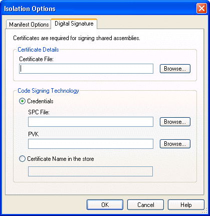 | Credentials | Select this option to use credential files as the code signing technology. If you select this option, you must supply the name and location of both your software publishing credential files: SPC FileandPVKFile. In order to receive a software publishing credentials and a private key, you must supply a certification authority, such as VeriSign, with specific information about your company and software. |