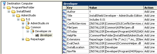 - In the INI File tree, select the INI file that you want to edit, and expand the listing so that you can select the appropriate section. That section’s keys, values, and actions are listed: