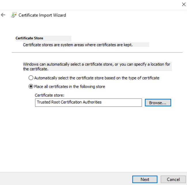 5. In the Certificate Store page, select Place all Certificate in the following store radio button. The Certificate Store field appears, browse and select the folder were you want to install the certificate. Click Next . ![](/images/Certificate Import Wizard 4.png)