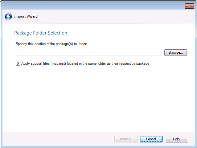 - Optionally, if you also want to import package support files (such as transforms or patch files), select the Apply support files (.msp, .mst) located the same folder as their respective package option.