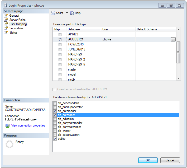 - In the  Database role membership for: [DatabaseName]  list, select db_datareaderanddb_datawriter.