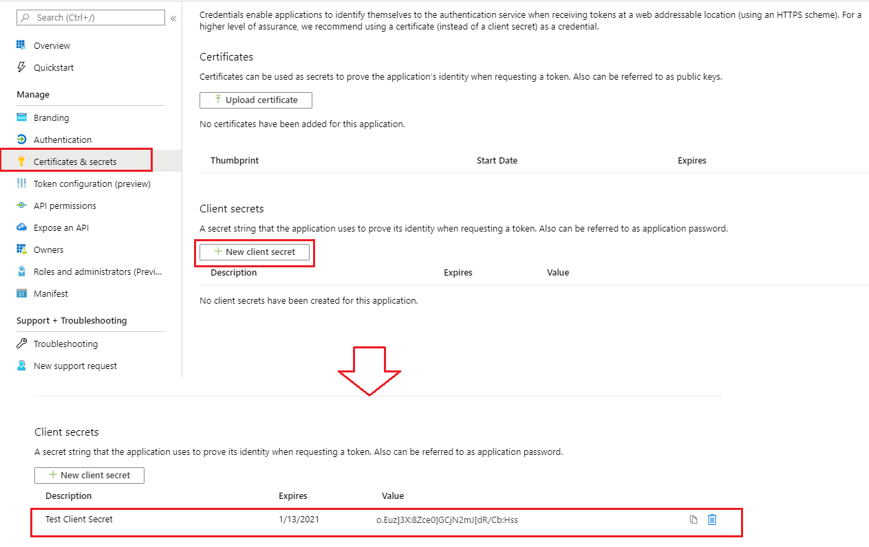4. The Client secret will then be listed in the Client Secrets section, copy the client secret Value , as it will only be visible and available to the user now.