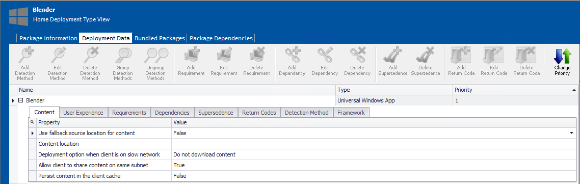The Content subtab of the Deployment Data tab of the Home Deployment Type View lists general information about package contents.