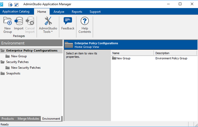 - Click on the  Environment  tab. The tree lists the Security Patches, OS Snapshots, and Enterprise Policy Configuration files that have already been imported into the Application Catalog.