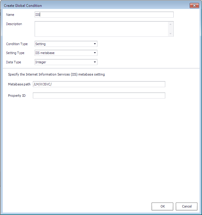 Setting TypeSelect one of the following options to identify the type of global condition that you are creating (the item you want this condition to assess for compliance): Active Directory query - Select to specify a condition to assess a Active Directory query Assembly - Select to specify a condition to assess an assembly from the global assembly. File system —Select to specify a condition to assess a file or folder. IIS metabase —Select to specify a condition to assess an IIS metabase. Registry key —Select to specify a condition to assess a registry key. Registry value —Select to specify a condition to assess a registry value. Script —Select to specify a condition to find a script and return a value to be assessed. SQL query —Select to specify a condition to assess an SQL query. Wql query —Select to specify a condition to assess a Windows Management Instrumentation Query Language (WAL) script. XPath query —Select to specify a condition to assess an XML file and XPath query.