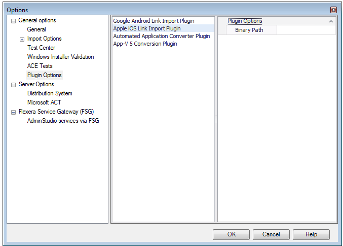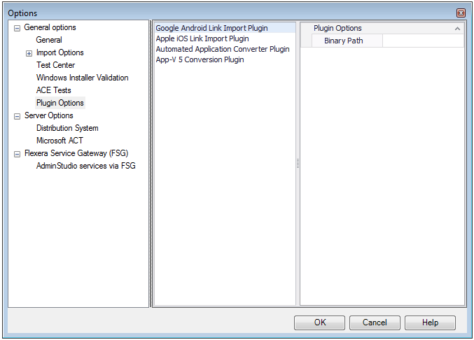 On the Plugin Options tab of the Application Manager Options dialog box, you can specify options for AdminStudio plug-ins including the import of Google Android and Apple iOS public store apps, Automated Application Converter, App-V 5 conversion, and Microsoft Intune conversion. The Plugin Options tab includes the following subtabs: