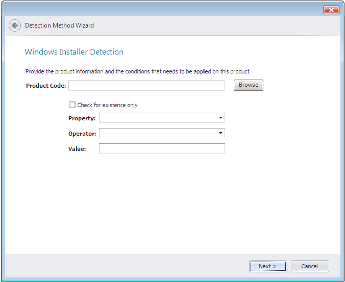 Property Operator ValueUse these fields to define a condition, using the Version or Upgrade Code property, that the specified Windows Installer file has to meet in order to be successfully detected. After you select a Property , the Value field is populated with a Version or Upgrade Code value from the selected Windows Installer file. Available operators are: Equals , Not equal to , Greater than or equal to , Greater than , Less than , or Less than or equal to . If you attempt to edit a Windows Installer Detection detection method, and you attempt to change the detection method property (from Upgrade Code to Version or vice versa), you may be required to required to browse to the Windows Installer file again to retrieve the new property value.